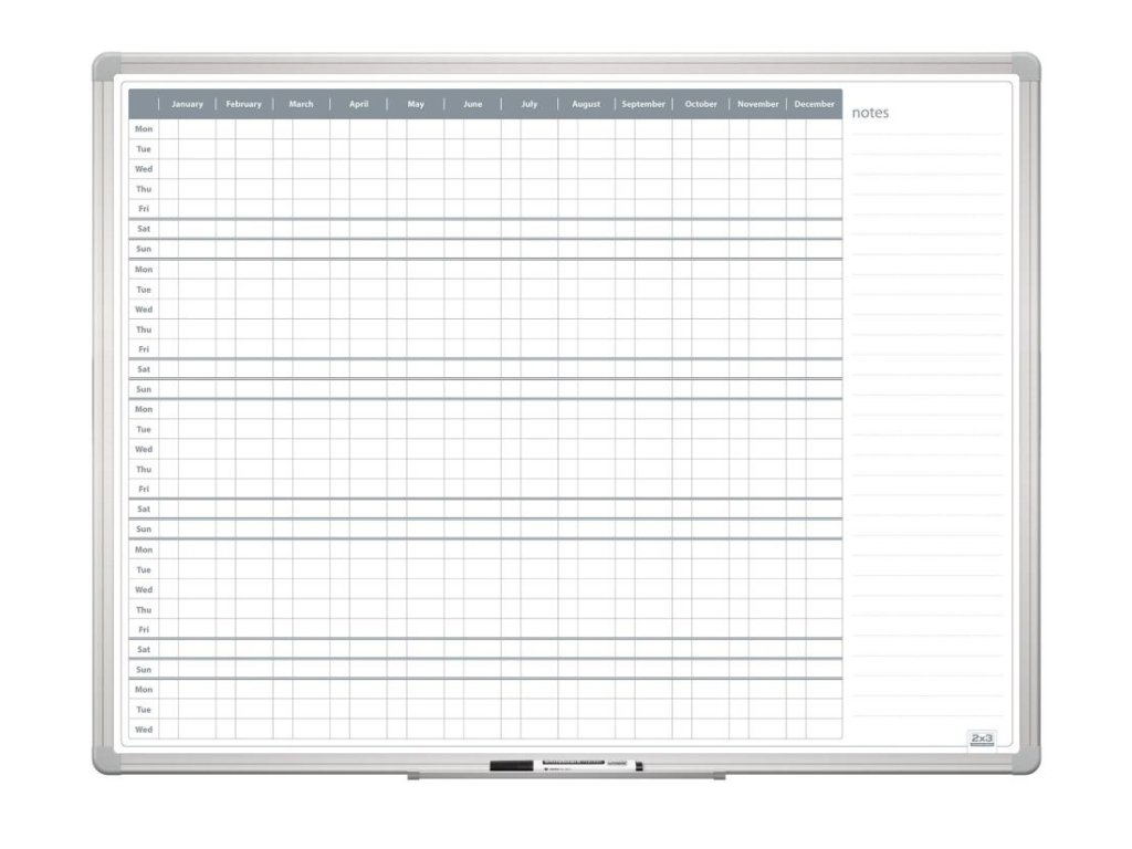 Praktická magnetická ročná plánovacia tabuľa s prehľadným rastronom na plánovanie počas celého roka a priestorom na poznámky. Tabuľa má odolný lakovaný povrch a pevný hliníkový rám, ktorý zaručuje dlhú životnosť aj elegantný vzhľad.